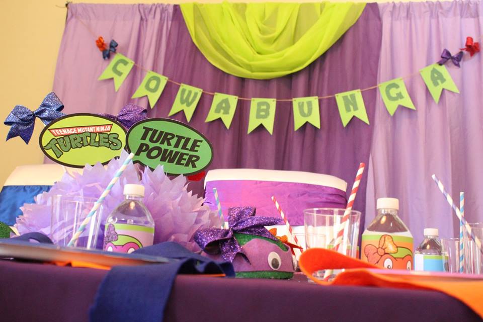 Cowabunga dudes! What an awesome, GIRLY Ninja Turtle themed party! We had so much fun planning this one. Guests made green slime (ooze), received glitter tattoos and mini manicures while they waited for the ‘special guest’ to arrive.