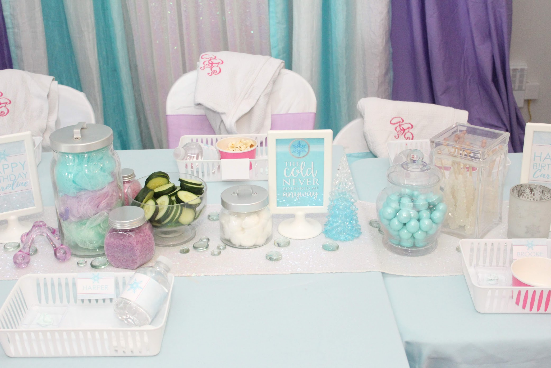 This MERMAZING spa party theme puts an ocean flair on our classic spa. The tranquil teal and purple colors shine through this theme with seashell accents and lots of sparkle. In addition, every guest will make their own mermaid scale glitter gel to use and bring home.